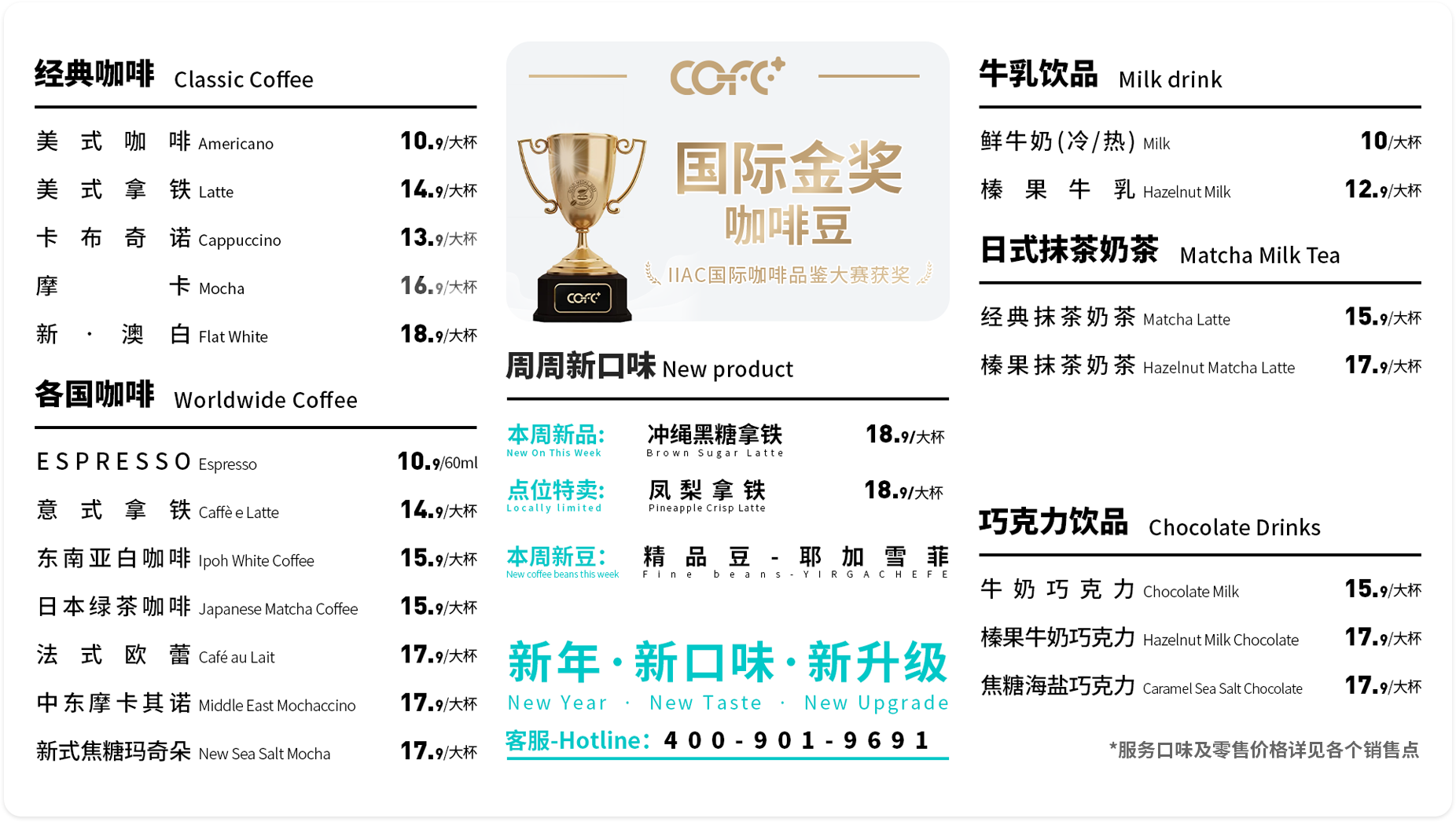 cofe+机器人咖啡亭的产品和价格以实际销售点为准